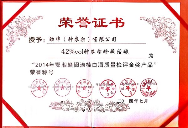 2014年7月,勁牌(神農(nóng)架)有限公司“42%vol神農(nóng)架珍藏活釀”榮獲2014年鄂湘贛閩渝桂白酒質(zhì)量檢評金獎產(chǎn)品“。