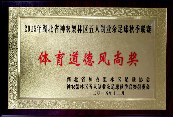2015年12月,榮獲湖北省神農(nóng)架林區(qū)五人制業(yè)余足球秋季聯(lián)賽”體育道德風(fēng)尚獎(jiǎng)“。